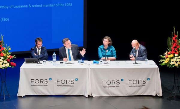 From the 10th anniversary of FORS in 2018. From left to right: Prof Dominique Joye (retired Professor at UNIL), Prof. Dr. Georg Lutz (Present FORS Director), Prof. Dr. Eszter Hargittai (Prof. at UNIZH) and Prof. Dr Georges-Simon Ulrich, Director of the Federal Statistical Office.